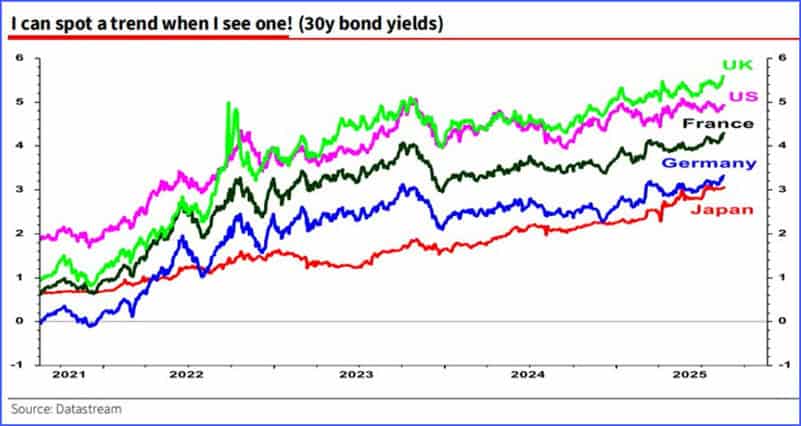 What do these rising long bond rates tell us? Well, clearly, people aren’t comfortable with lending sovereign governments money for a 30-year term. Like us, they are probably thinking that the fiscal prospects of these countries are terrible, especially over a 30-year time frame.
