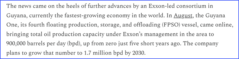 The news came on the heels of further advances by an Exxon-led consortium in Guyana, currently the fastest-growing economy in the world. In August, the Guyana One, its fourth floating production, storage, and offloading (FPSO) vessel, came online, bringing total oil production capacity under Exxon’s management in the area to 900,000 barrels per day (bpd), up from zero just five short years ago. The company plans to grow that number to 1.7 million bpd by 2030.