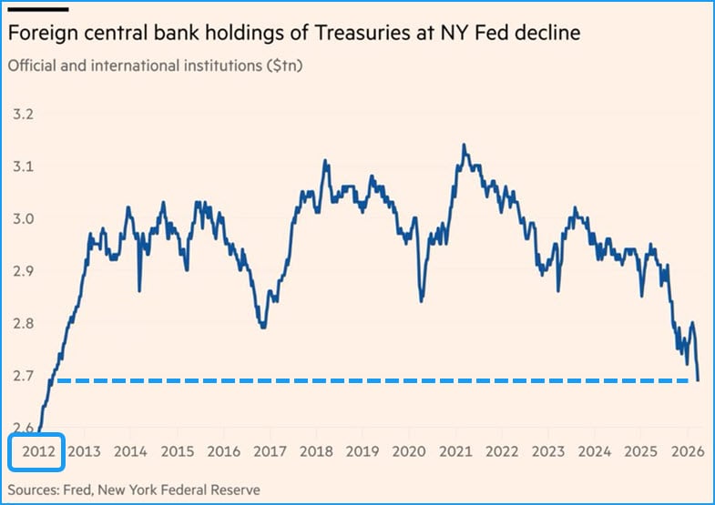 Foreign central banks have reduced NY Fed Treasury holdings by ~$100B, back to 2012 levels, despite U.S. debt having doubled over that time frame.