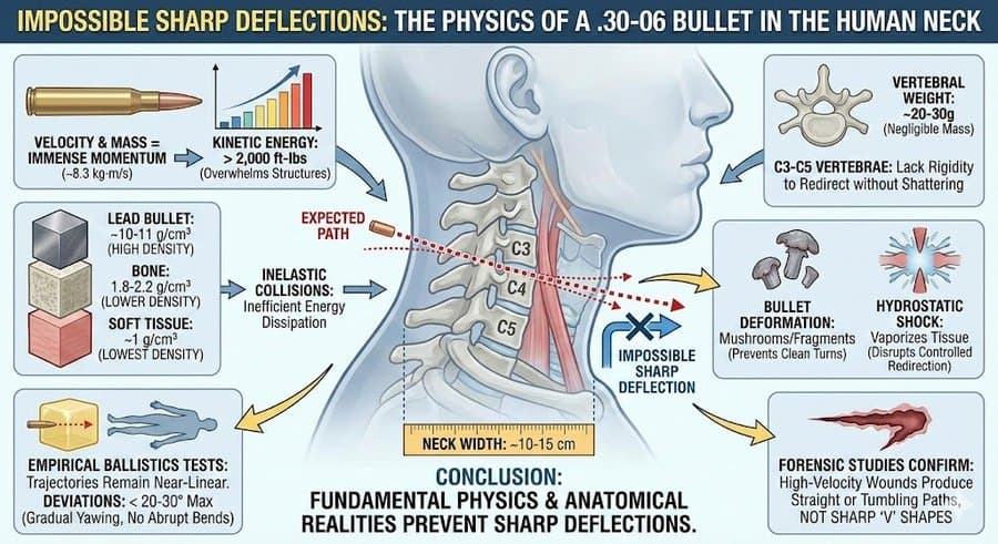 A .30-06 rifle bullet possesses immense forward momentum due to its high velocity and mass, making sharp angular deflections within the human neck highly improbable.