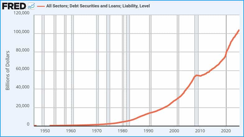 But the private sector does not live in a vacuum, and there, too, the message was received; borrow, borrow, borrow! And borrow we all did – there’s now just over $104 trillion of debt outstanding across all sectors of the US: