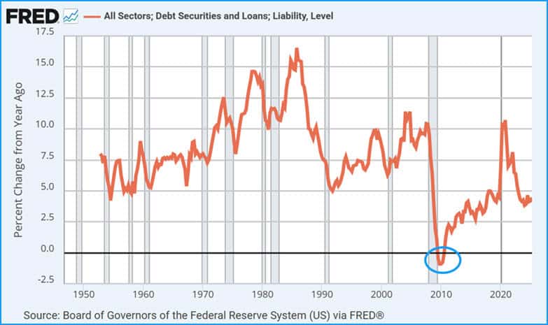 So, let’s look at that same data but expressed as a percent change in total debt as compared to a year ago: