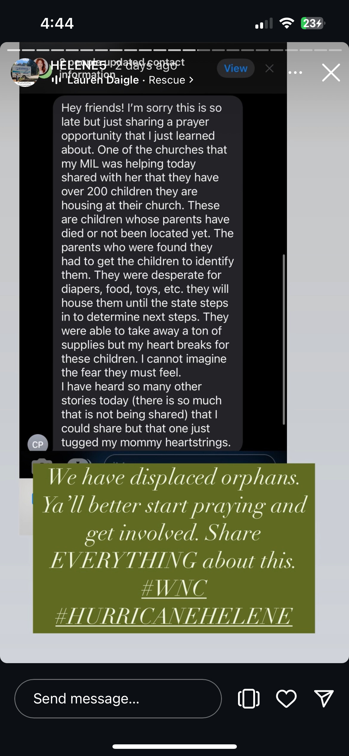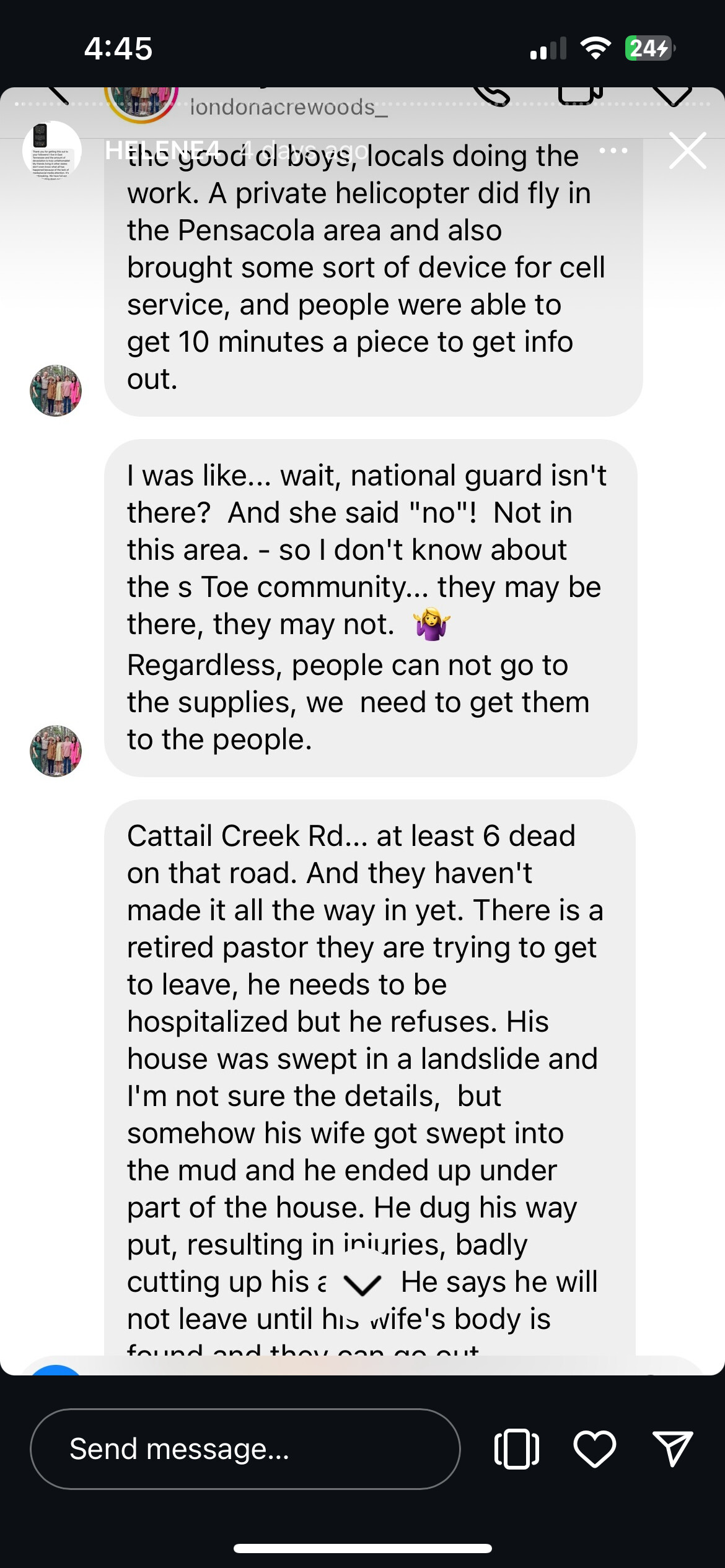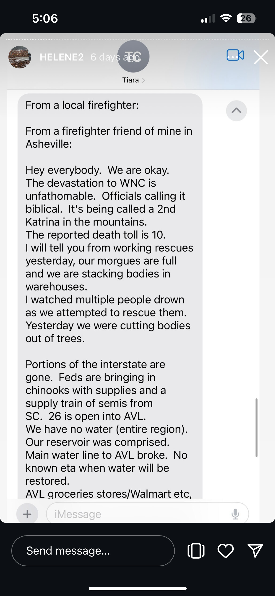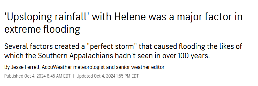 Greg Biffle, a retired NASCAR driver has been flying in and out with supplies (in his own helicopter). He is also keeping a running list of people that are found (alive, I believe), handwritten in a notepad so that it can be cross checked by others searching for loved ones. Another poster on ‘X’ is sharing posts of missing people with a picture of the missing person so they can be identified. She also posts when someone is found. So far, the number found is tiny in comparison to those still missing. I wouldn’t be surprised, at all, if the death toll is much higher than the 9/11 toll. I am only now hearing anyone in the MSM talk about this, but it still being done in a cursory way. “Oh, by the way, NC got hit with flooding” type of BS. The only real coverage that I have seen has been on ‘X’ and almost ALL of that is from volunteers on the ground. I saw a local woman on a local news channel sharing her experience of sitting on a roof with her son and his grandparents and she watched as her son & the grandparents were swept away. Dear God. I have watched more grown men holding back tears in the past couple of days than at any other time of my life. I have also witnessed the absolute FURY coming out of this region by the complete ineptitude and complete lack of respect for life that anyone associated with the govt is showing.
