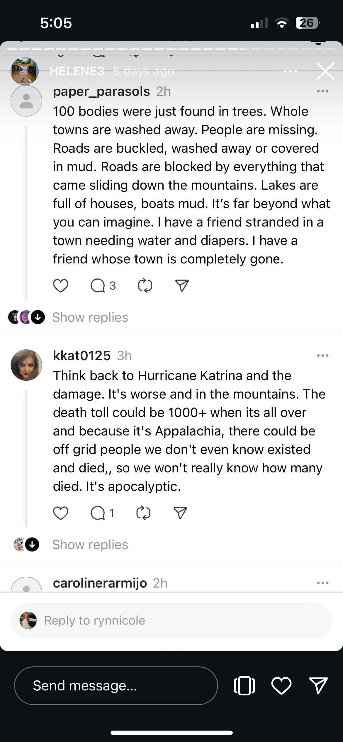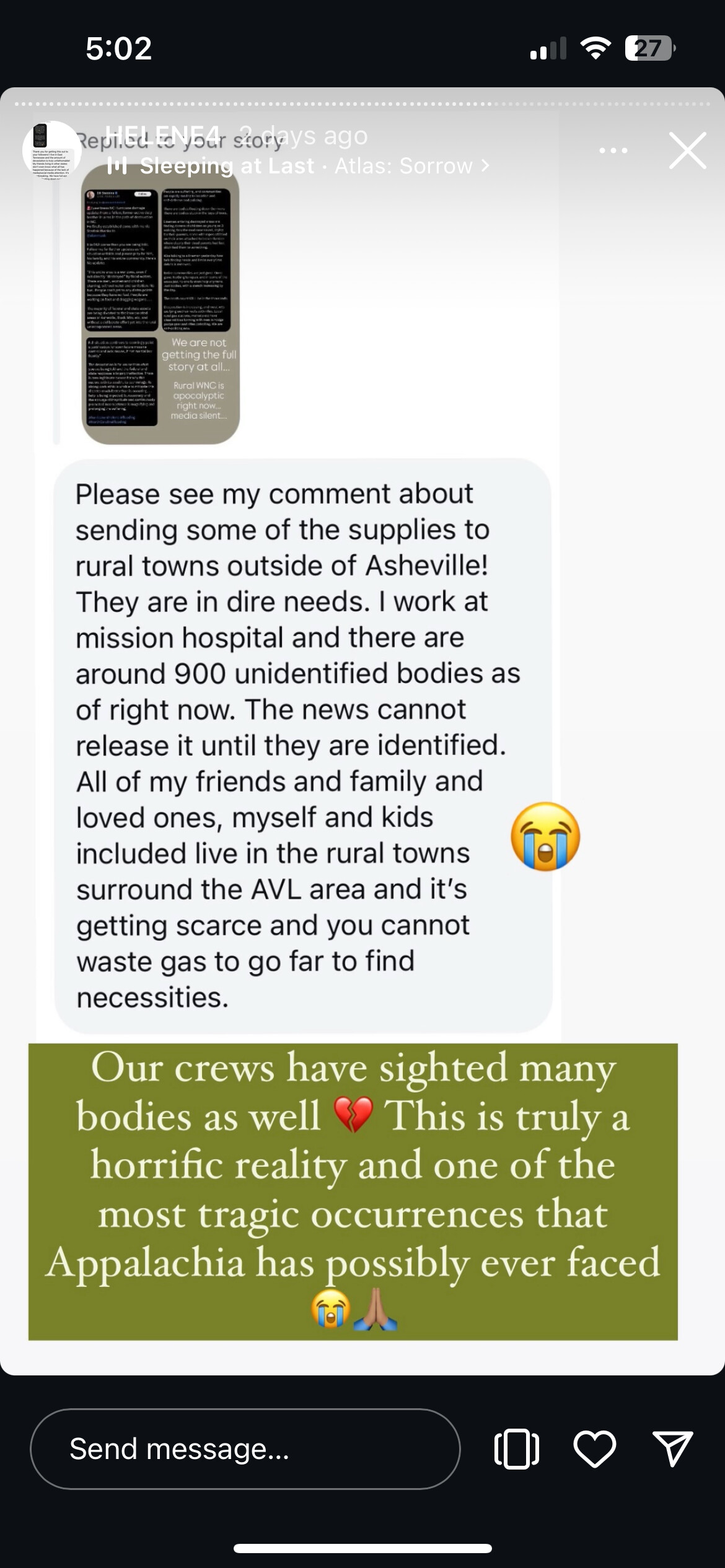This woman is documenting day by day what’s happening. You can click on the day tabs on her instagram. Insane stories about 200 kids without parents… where they are finding people and how many have died. There is simply no way the media is remotely close on death counts. No way.