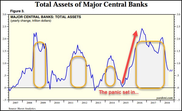In the chart above, you can see where the central banks panicked back in mid-2015. It didn't take long for their combined printing hit the highest run-rate of the entire crisis at $2.5 trillion dollars by mid-2016. They then kept the pedal to the metal clear through mid-2018. This represents by far, the largest stimulus of the entire mis-begotten Quantitative Easing experiment that began after the GFC -- printing up money from thin-air to jam into the financial markets (and thus into the portfolios of the rich).