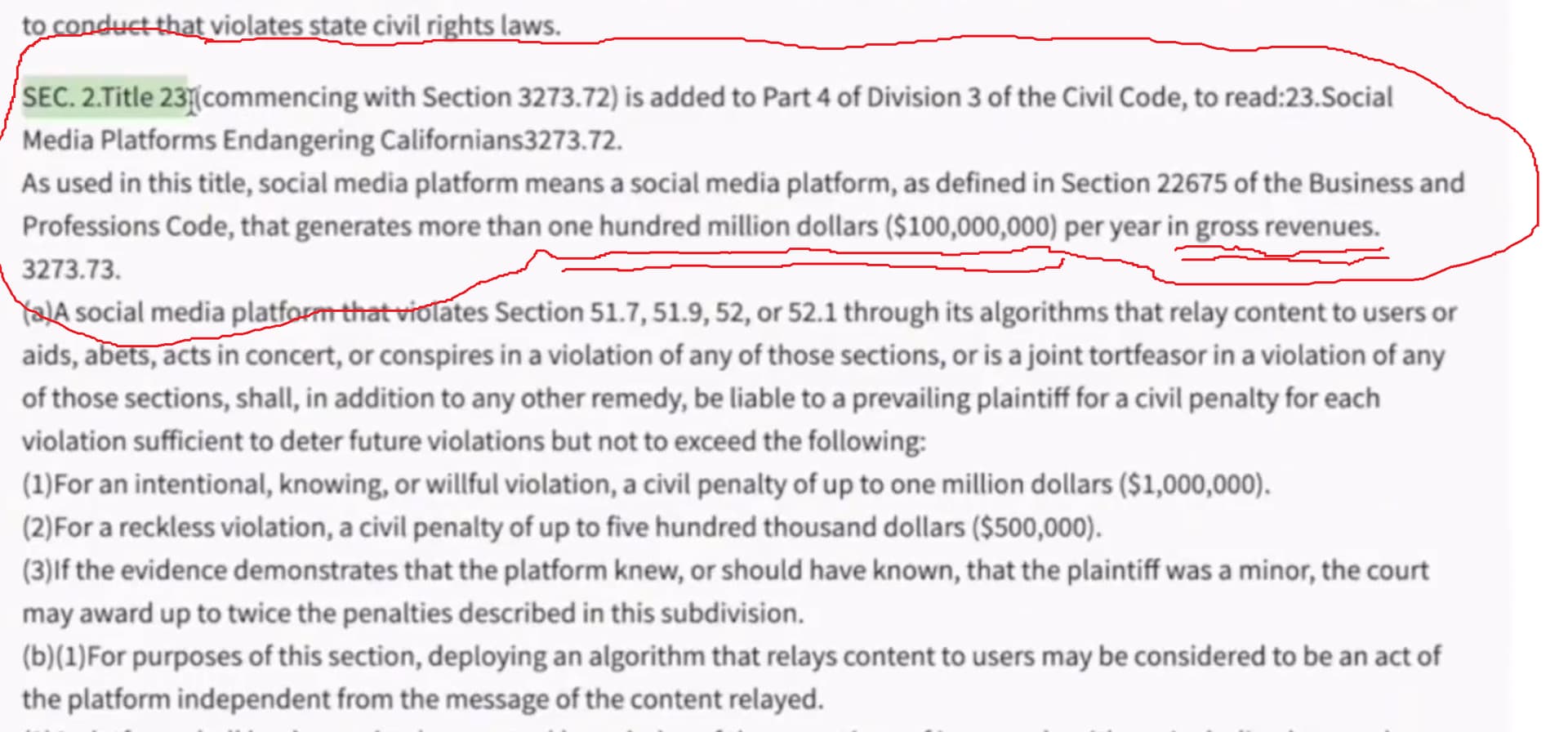 If you post something on social media, anywhere online, that the state of California deems to be hateful, there’s a penalty for that reckless violation, a civil penalty of up to $500,000 for an intentional, knowing or willful violation, a civil penalty of up to $1 million.