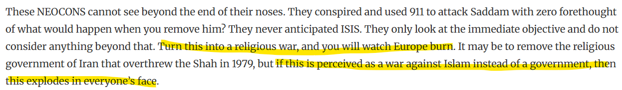 Conflating support for anything a modern nation state can dream up, with support for an amalgamation of people who hew to a particular set of religious beliefs, makes zero sense to me, and nobody has been able to parse it out in a way that does.