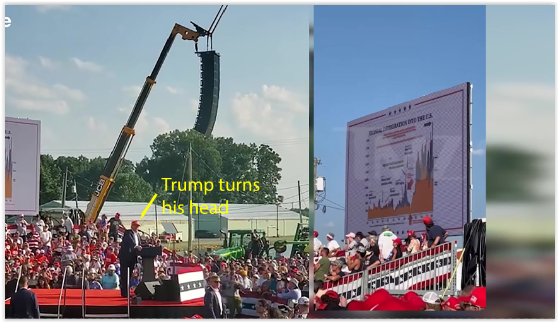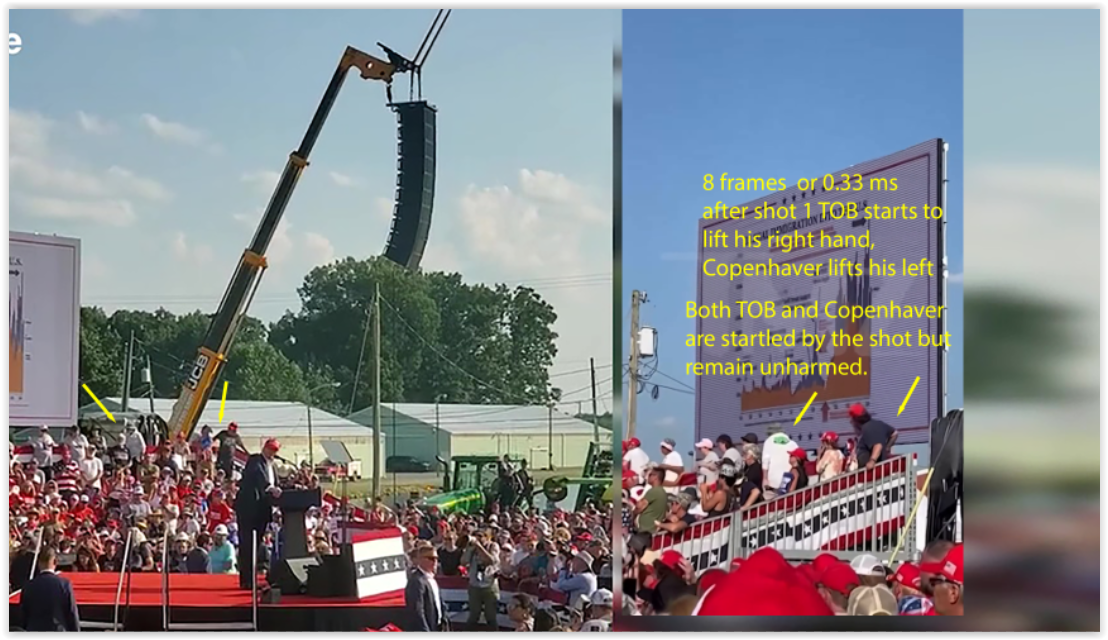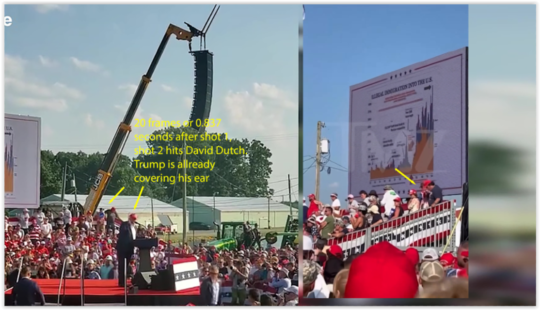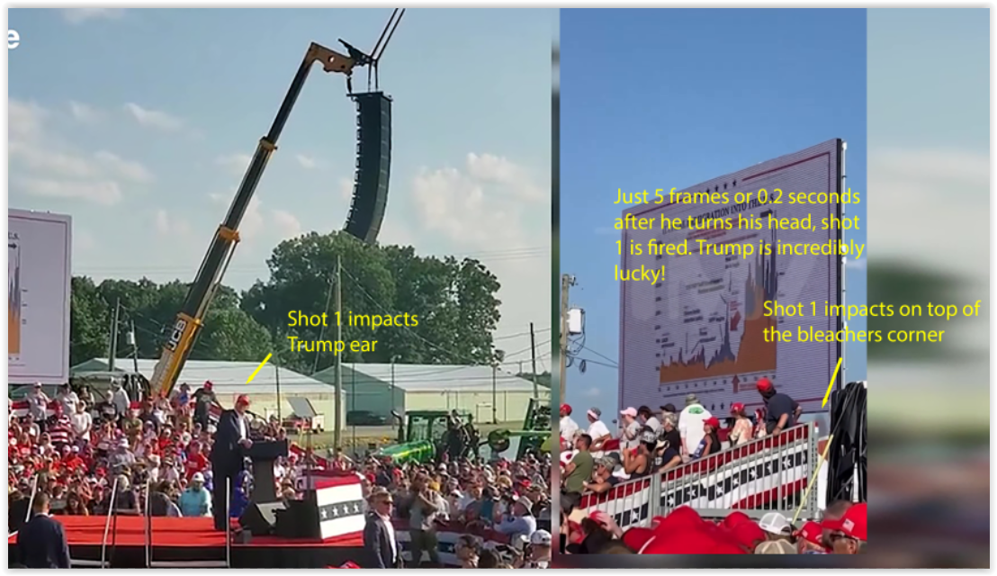 At this point, I feel we’re going in circles on this issue. To resolve it definitively, I made a frame-by-frame comparison of both videos, side by side. When you watch them in sync, you can literally see that the first shot is the one that hits Trump’s ear and the bleachers — at the exact same moment.