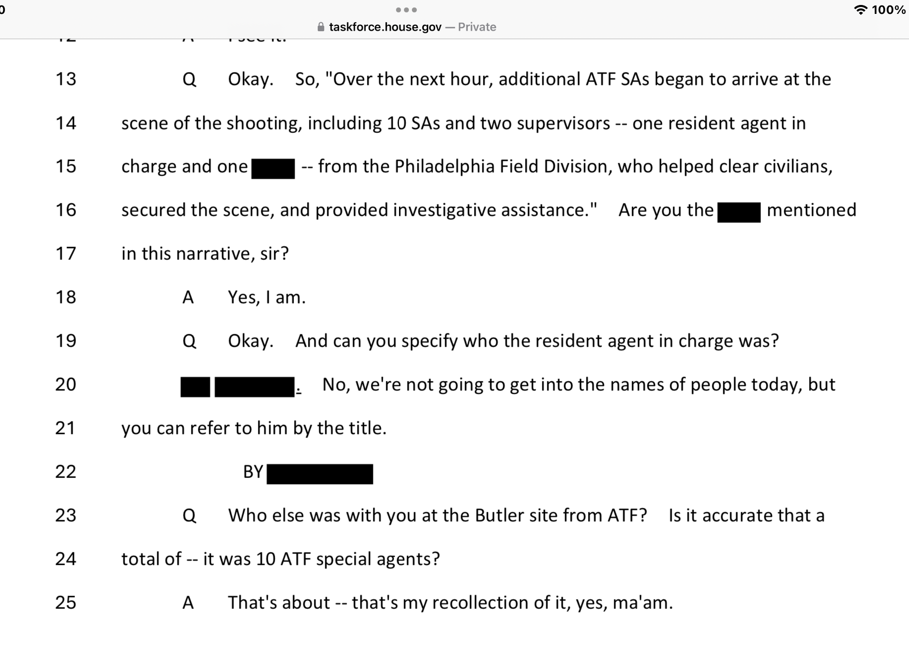 Regarding the number of ATF agents that responded to the rally site after the shooting, ATF Agent 1 confirmed there were 10, plus they had 2 supervisors. (Page 19 of transcript.)