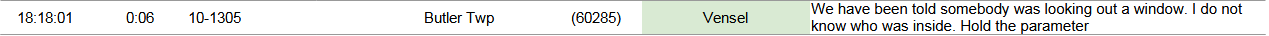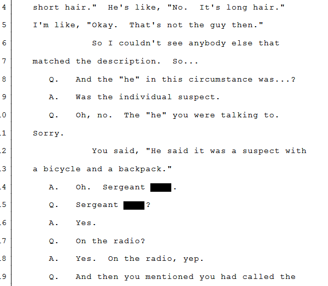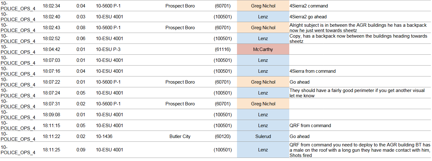 Q: It says 18:02:52 – or 18:02:43 – and it says, “. All right. Subject is in between the AGR building with his backpack. Just went around towards Sheetz.”