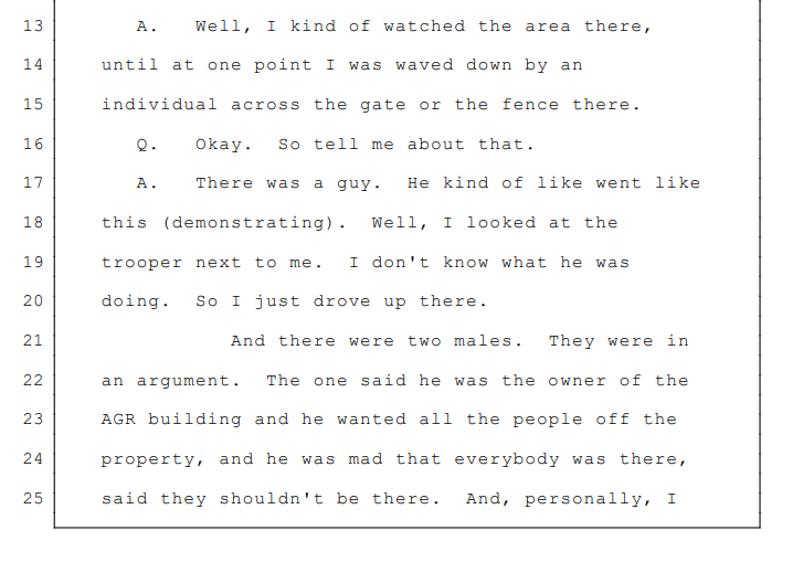 A: Once I hear the shots were fired, I head back to that because like I said, at some point, I believe, after the shots were fired, I heard on the radio, “Shooter on the roof of the AGR building,” or something to that effect," because at that point I was like, “Shit. I’m in the AGR building.”
