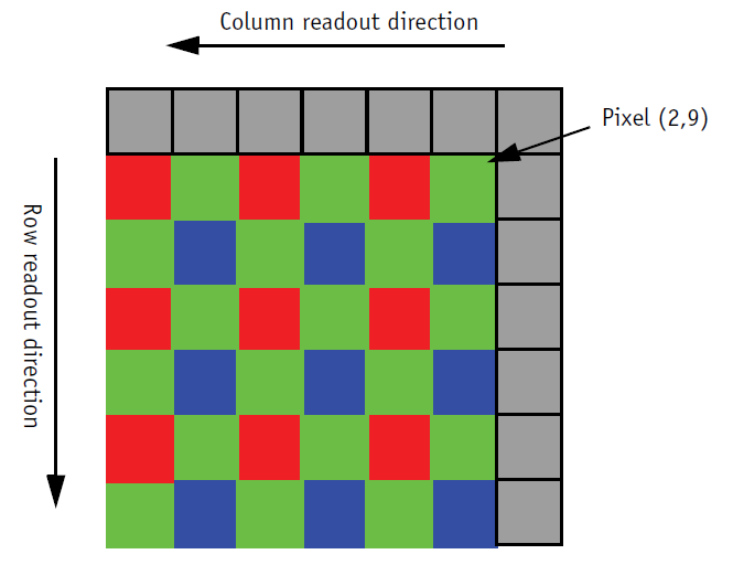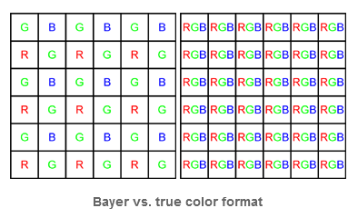 So you can see that cameras do not collect all color information at each pixels. The visualization must calculate the “full” color information from neighboring pixels, which contain only one pure color captured.