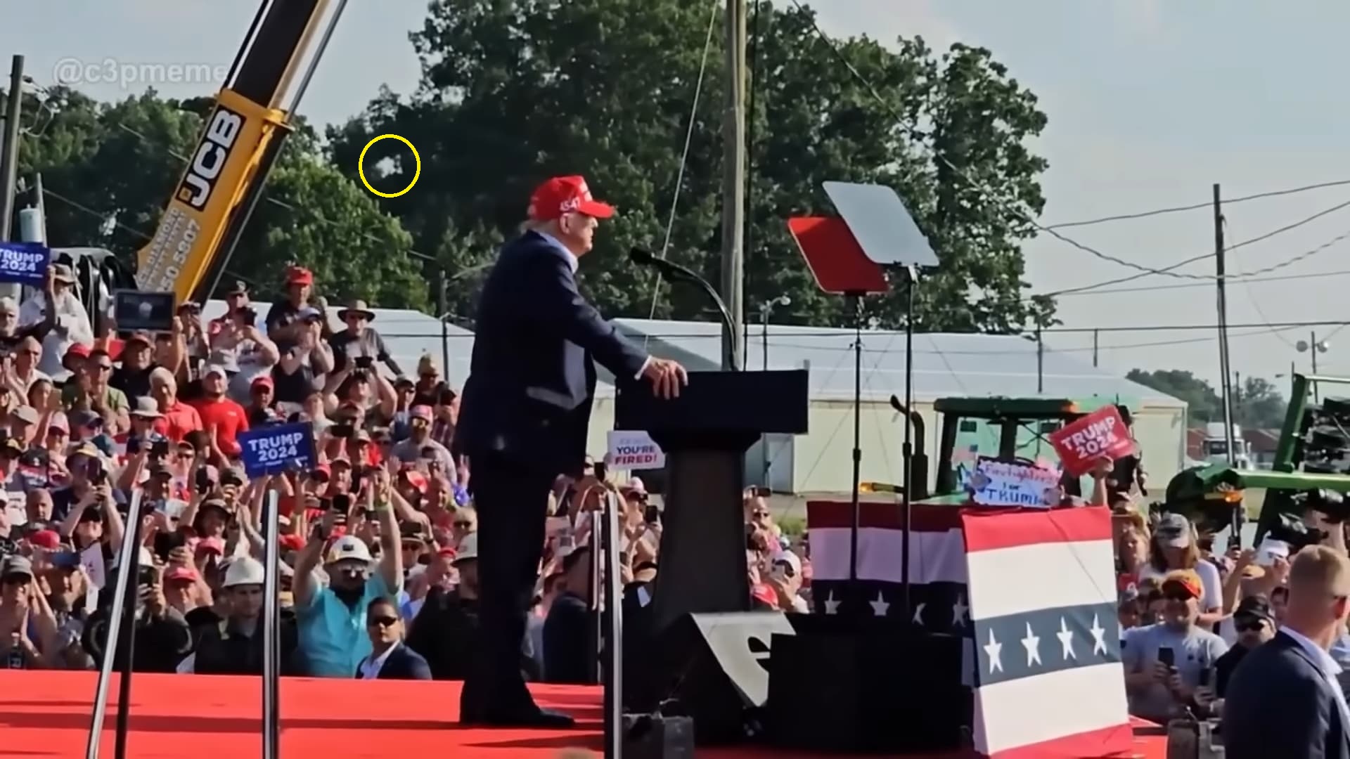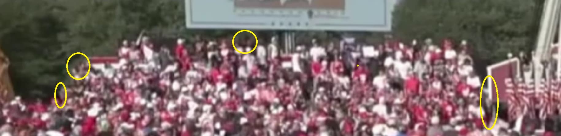 I am still trying to find the shooter hiding in the trees [Right of Trump`s podium]. I beleive i know where this shooter is hiding possibly on a platform wedged inbetween tree branches high up in the trees.