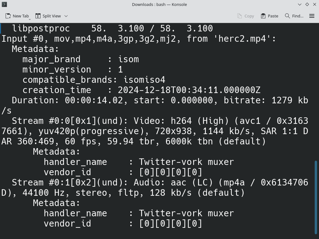 I got the 14.02 second video, ran ‘ffprobe’, which seemed to think it was 60 fps, with a ‘time based rate’ of 59.94.