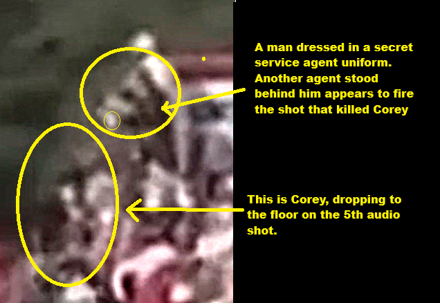 A gun fight broke out around the bleachers stand were Corey was in. I have studied one old video again, and another one i have found. I have done a lot of work on it, zoomed in etc. It is a lot worse than i thought. 3 secret service agents on the LHS, and 2 secret service agents and someone else on the RHS. At the top of the bleachers another person. 5 of them have their guns drawn and pointing them. I have managed to do a close up edited video of Corey. He was still standing after the first 4 audio shots were fired. The 5th shot hit the left hand side of his head, and he dropped down flat. Judging by were all the 6 agents were positioned, and Cory being shot on his LHS of his head. A secret service agent somehow climbed up behind the bleachers far corner, his gun drawn, and there appears to be a muzzle flash. I am not sure. I will post these images later for other people`s opinions.