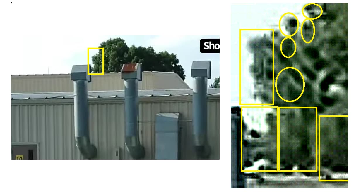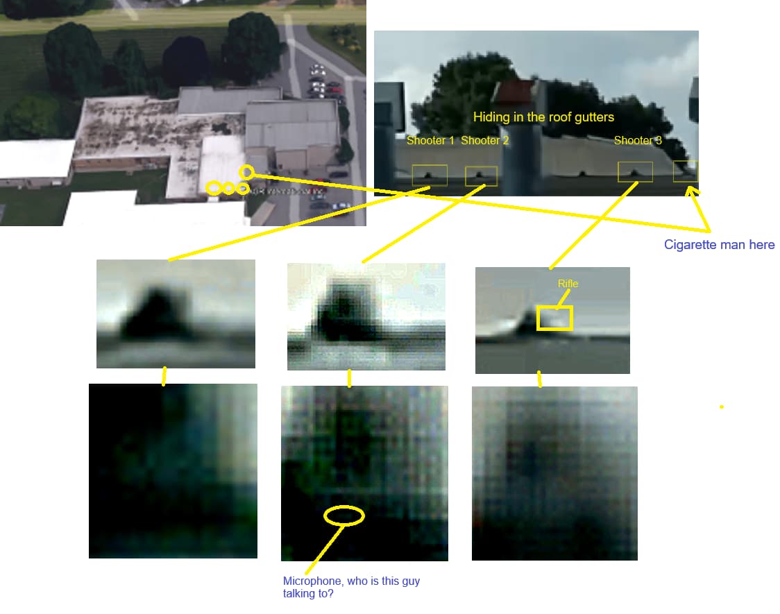 I have zoomed right into the metal roof pencil holes. In each hole, there is a person inside there peeping through or part of the roof lifts up. One of them had a helmet with a microphone talking to someone. The other looks like he is just observing. The pencil hole far right holding a rifle and could be one of the shooters firing the audio shots.