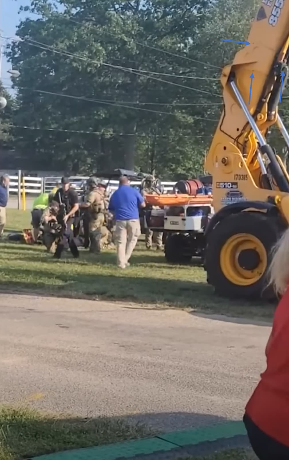IF one were to assume the shot that hit the telehandler came from “Crooks” location or along a close line, it would have passed through where the lady in the red hat next to David Dutch is in this photo (she would have ducked by then). This was taken Mr. Comperatore.