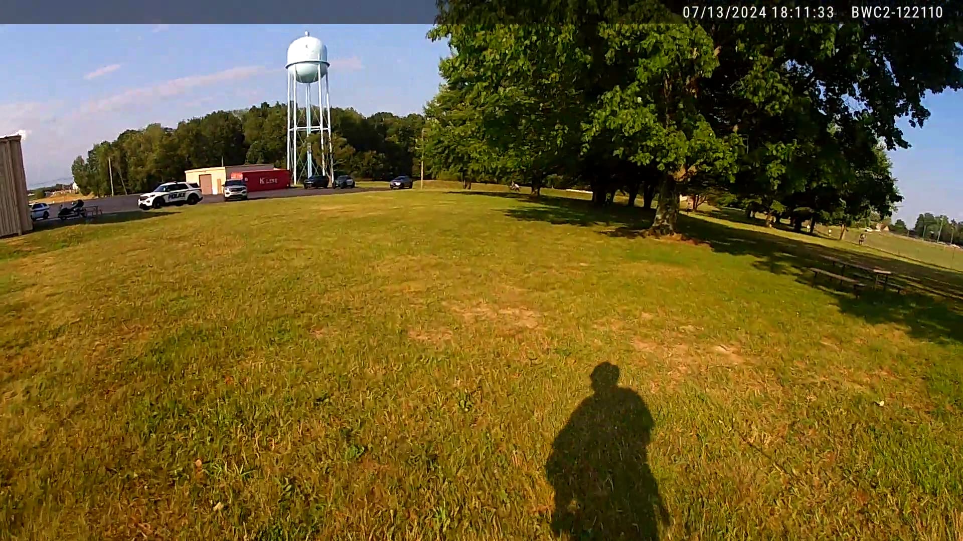 Lt. Pearson’s bodycam has no audio. But he stepped behind the flag holder crane truck first, and visited the other side of that truck. When he returned to the west side of the truck, we can see Mrs. Martin turned back and started running. (I don’t blame her. She wanted to take some photos of the commotion. She didn’t.(?) But she obscured a few seconds from the bodycam footage.) So it is after the first shot rang out.