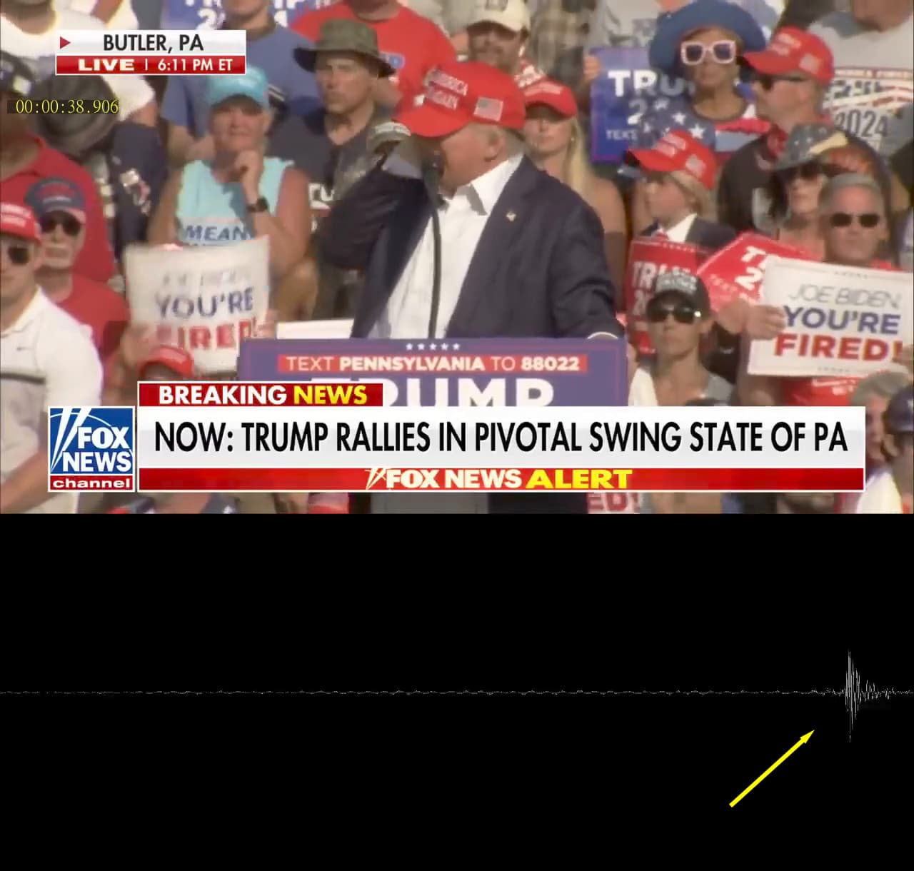 The yellow arrow marks the crack from Shot 2. This example is clear because there are no delays: the bullet passes right by Trump’s microphone, so the crack sound is heard almost instantaneous.