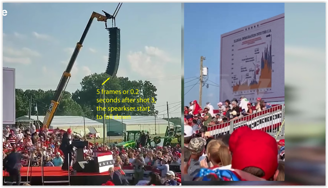 0.2 seconds after shot 3, the speakers begin to fall — proving that the hydraulic cylinder, which acts as a counterweight, was compromised by the shot.