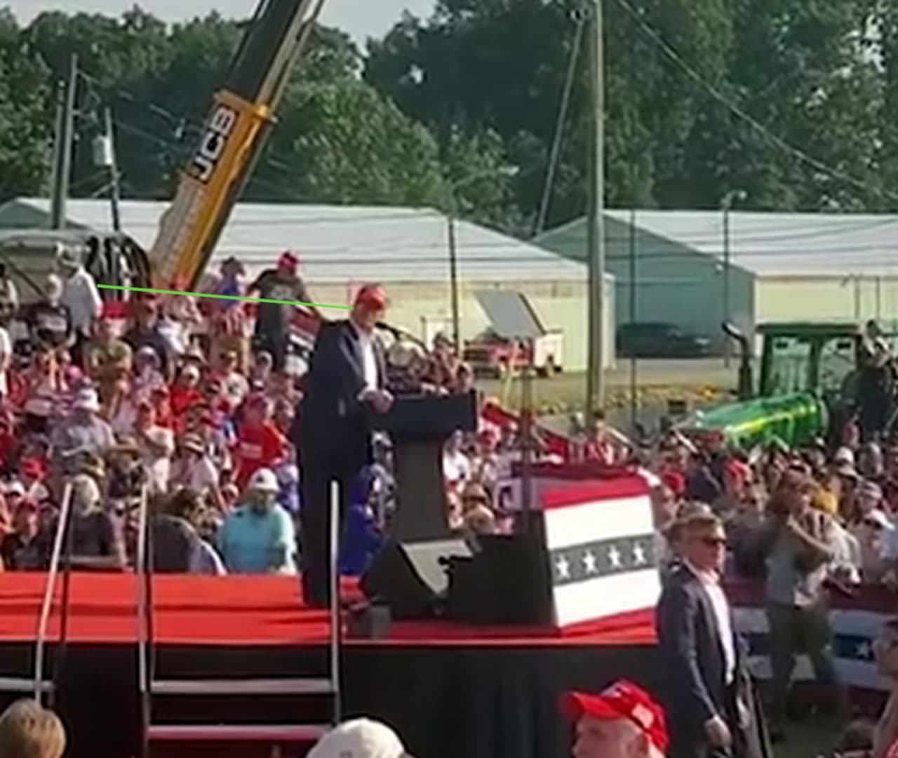 The fact that the top corner of the bleachers is higher than Trump’s ear produces a trajectory, showing that shot 1 originated from the AGR Building 6 near Window 2.