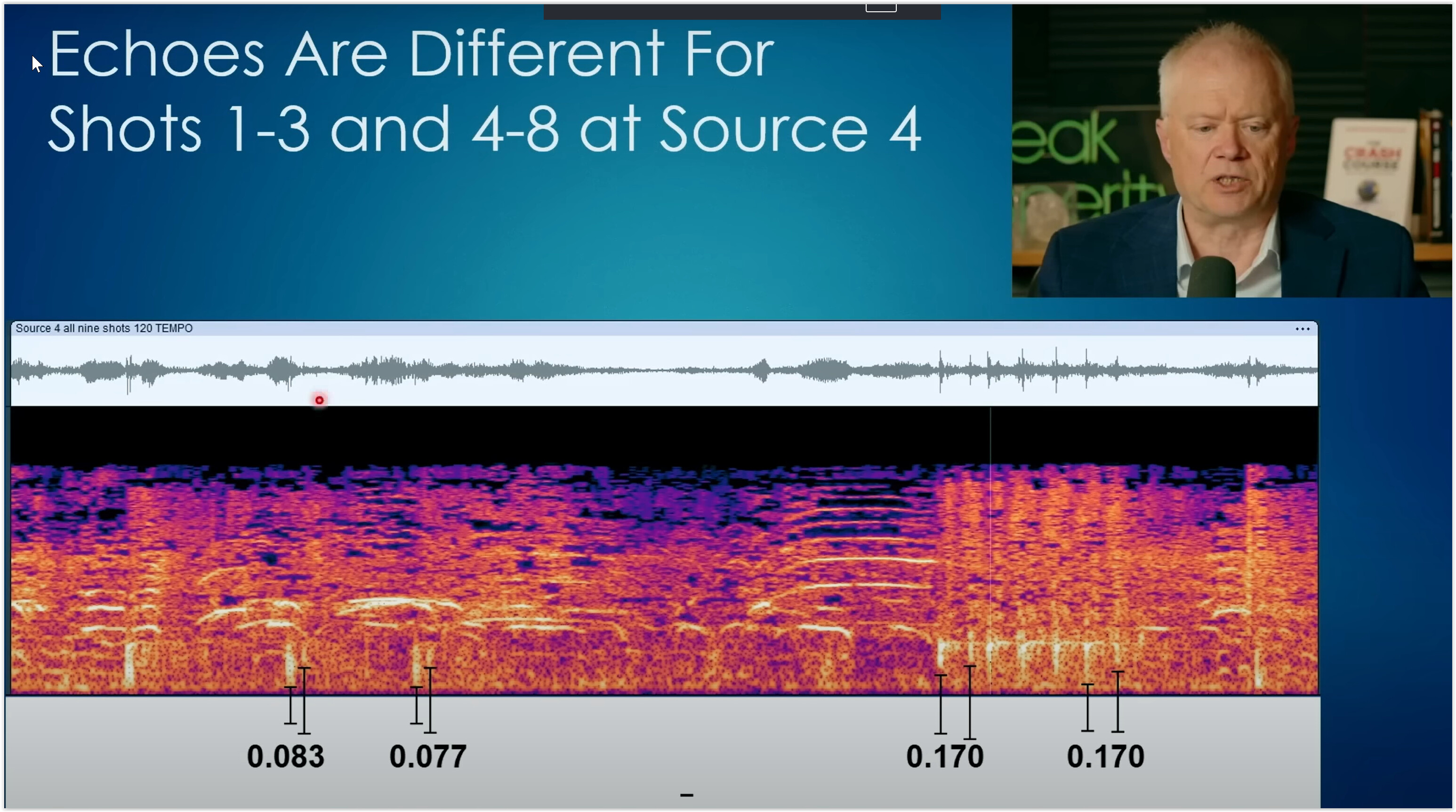 You pointed out Chris’s video where he says that Source 4 has an echo at about 0.080 for shots 1-3 and at 0.170 for shots 4-8. After my examination, I concur with @cmartenson that the only noticeable echo for shots 1-3 is at about 0.080.