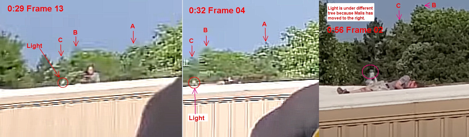 I put together a few photos that compare the last frame where he can be seen fairly clearly with that same spot one second before he’s shot, with a picture of him dead on the roof: