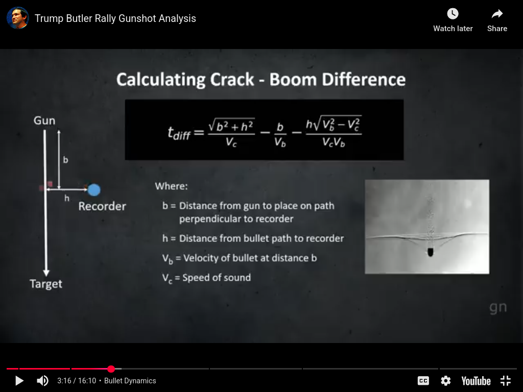 The crack-bang formula you put up around 2:16 involves the distances b and h. But aren’t they precisely what is in question? You may assume values of b and h and see if the calculated crack-bang gap matches that measured. But you say you are using the formula to derive the boom time from the crack time? Is that right?