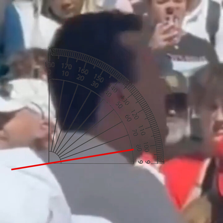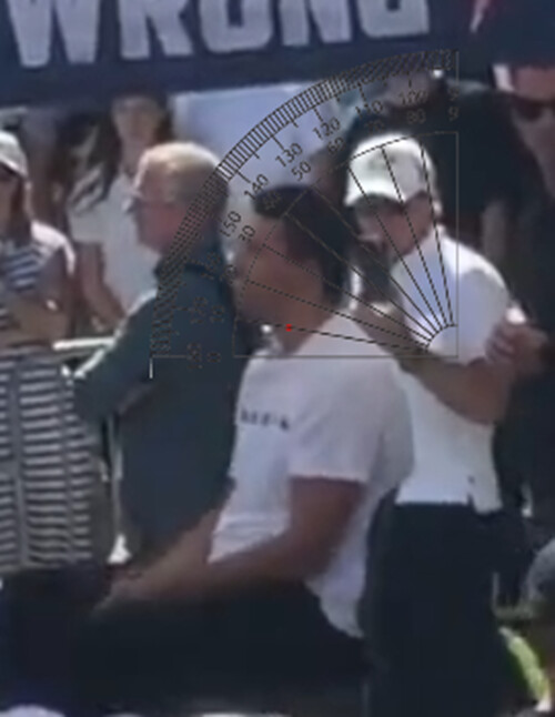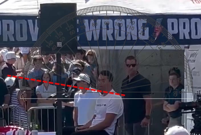 Someone’s going to have to slow down the video to get a better estimate of the delay between the dark-haired young man’s shudder (presumably from the shock wave and the crack from the muzzle. It would also be good to have a rough estimate of the delay between a college aged person feeling the shock wave and visibly shuddering. Really rough: 3000 ft/s bullet - 1100 ft/s sound = 1900 ft/s. About 0.4 second delay (perhaps longer allowing for reflex delay) = 0.4 x 1900 = 780 ft (or more) distance from gun to the young man. That seems too far, as there are no possible shooting positions from 260 yards away.