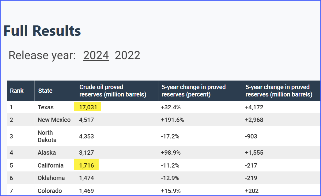 Looks like CA has a full order of magnitude less oil than TX. So it’s not really credible to claim “CA has has much as TX”