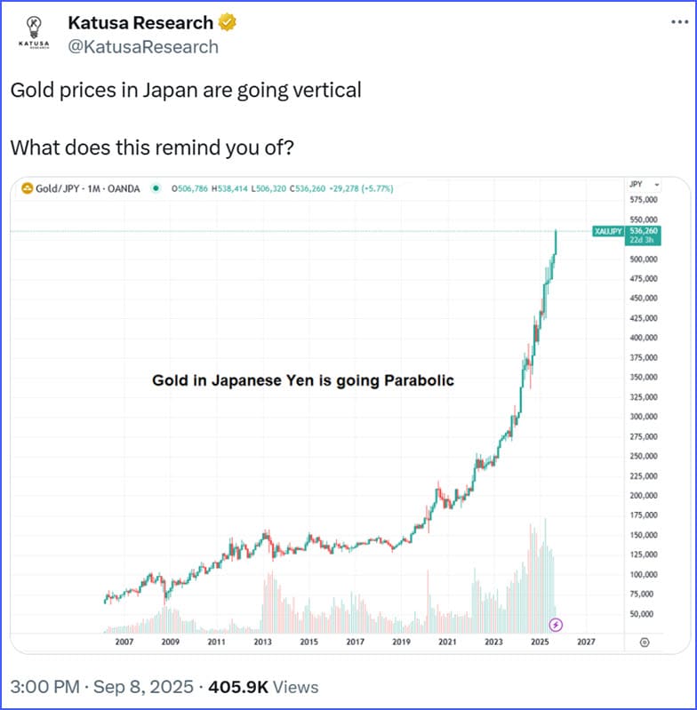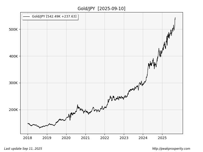 Here’s the gold-jpy chart since 2018. (Trying to put it in the same yearly context as the Weimar chart). Starting price in 2018 is roughly 146k JPY. Current price: 542k JPY.