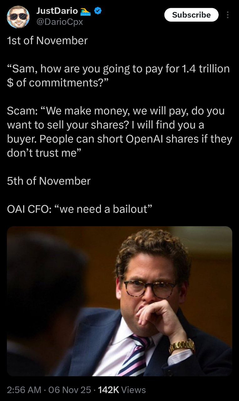 Sam Altman over at OpenAI wants the US government to provide and guarantee loans for its expansion.Up to a trillion.No, I’m not joking. pic.twitter.com/i4XRjpPPQn